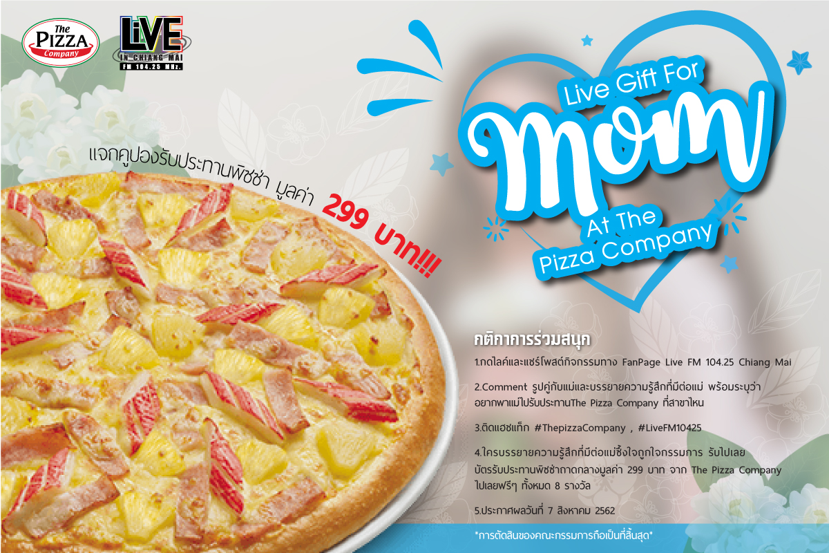 แจกบัตรรับประทานพิซซ่าถาดกลางมูลค่า299บาท ฟรี! (8รางวัล)กติกาการร่วมสนุก1.กดไลค์และแชร์โพสต์กิจกรรมทาง Fan Page Live FM 104.25 Chi...