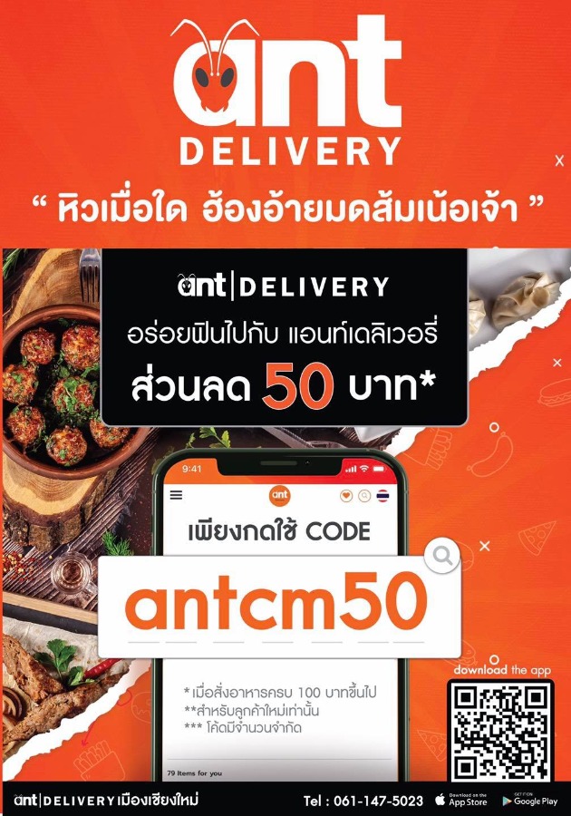 Ant Delivery แอพพลิเคชั่นสั่งอาหารเมืองเชียงใหม่ เปิดตัวแล้ว 1 พ.ค.ที่ผ่านมา พร้อมโปรโมชั่นมากมาย หลายร้อยร้านค้าให้ได้เรียกใช้บริการ ส่งฟรี 3 กม.แรก Ant Delivery แอพพลิเคชั่นสั่งอาหารของคนเชียงใหม่ "หิวแล้วสั่งเลย"