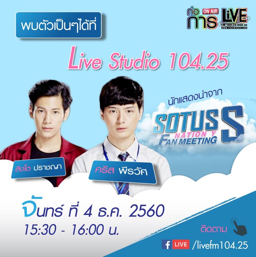 ภารกิจก่อการไลฟ์เปิดบ้านก่อการกับนักแสดงนำจาก Sotus S The Series ที่จะยกทีมมาว้าก!! ถึงเชียงใหม่ นำโดยคริส พีรวัสและสิงโต ปราชญา พร้อม Fan Meeting ที่หลายคนรอคอยกับนักแสดงคู่จิ้น ให้ฟินกันถึงเชียงใหม่ และพบกับคริส&สิงโต แบบใกล้ชิด สดจาก Live Studio 104.25 พร้อมกันทั่วประเทศตั้งแต่เวลา 15.00 น.เป็นต้นไป ติดตาม FB Live!