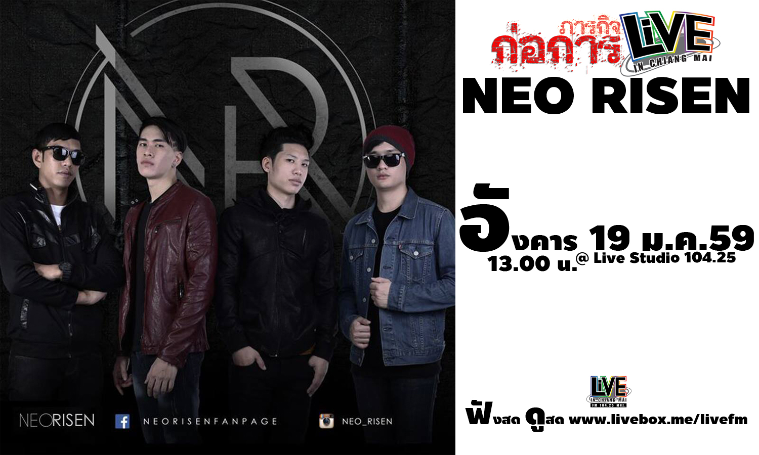 ภารกิจก่อการ Live วันอังคาร 19 ม.ค.59 เปิดบ้านต้อนรับศิลปิน "NEO RISEN" Neo แปลว่า กำเนิด , Risen แปลว่า ผงาด และรวมกัน Neo Risen ...