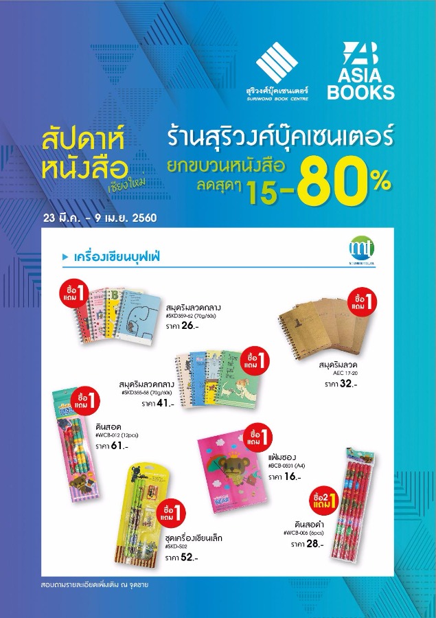 ร้านสุริวงศ์บุ๊คเซนเตอร์ ร้านหนังสือของคนเชียงใหม่ จัดสัปดาห์หนังสือเชียงใหม่ ครั้งที่ 1 ตั้งแต่วันที่ 23 มีนาคม - 9 เมษายน 2560 ยกขบวนหนังสือมากถึง 100 สำนักพิมพ์ เอาใจนักอ่านในจังหวัดเชียงใหม่และภาคเหนือ จัดโปรโมชั่นลดกันแบบสุดๆ ตั้งแต่ 15-80% พร้อมแผนกเครื่องเขียน จัดโปรโมชั่นบุฟเฟ่ต์ 1 แถม 1 และช้อปครบตามเงื่อนไข รับของแถมกลับบ้านกันอีก ติดตามรายละเอียดเพิ่มเติมได้ที่ Facebook สุริวงศ์บุ๊คเซนเตอร์