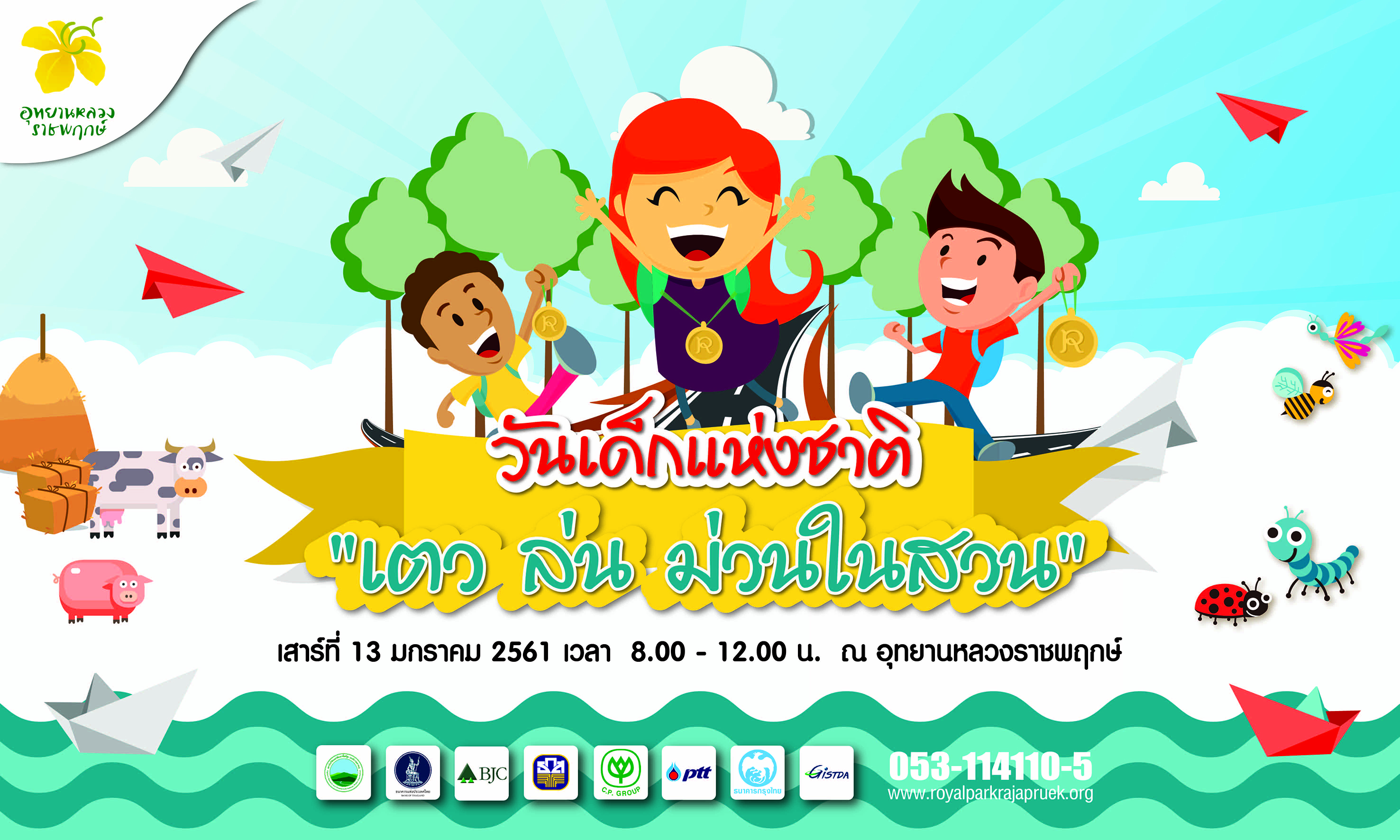 อุทยานหลวงราชพฤกษ์ ขอเชิญน้องๆ ร่วมกิจกรรมวันเด็กแห่งชาติ ในเทศกาลชมสวน ในวันเสาร์ ที่ 13 มกราคม 2561 เวลา 08.00 - 12.00 น. ณ ลานส้มสุก พบกับกิจกรรมเสริมทักษะและช่วยเติมแต่งจินตนาการ เรียนรู้สร้างสรรค์ก้าวทันยุค 4.0 กิจกรรมรักษ์โลก การแสดงดนตรีจากเยาวชน และร่วมเล่นเกมส์ชิงของรางวัลมากมาย สอบถามเพิ่มเติม 053 114 110 ถึง 5
