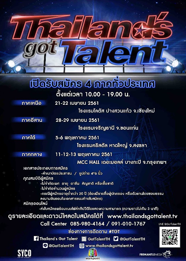 Thailand's Got Talent ซีซั่นใหม่ มาพร้อมกับช่อง Workpoint เลข 23 เปิดโอกาสให้กับทุกคนที่มีความสามารถ ไม่ว่าโชว์ของคุณจะเป็นแบบไหน, ไม่ว่าคุณจะเพศอะไร อายุเท่าไหร่ ไม่สำคัญ สามารถร่วมออกรายการได้ เปิดรับสมัคร 4 ภาค ติดตามรายละเอียดเพิ่มเติมที่ www.thailandsgottalent.tv Call Center 085-980-4164 / 091-010-1767