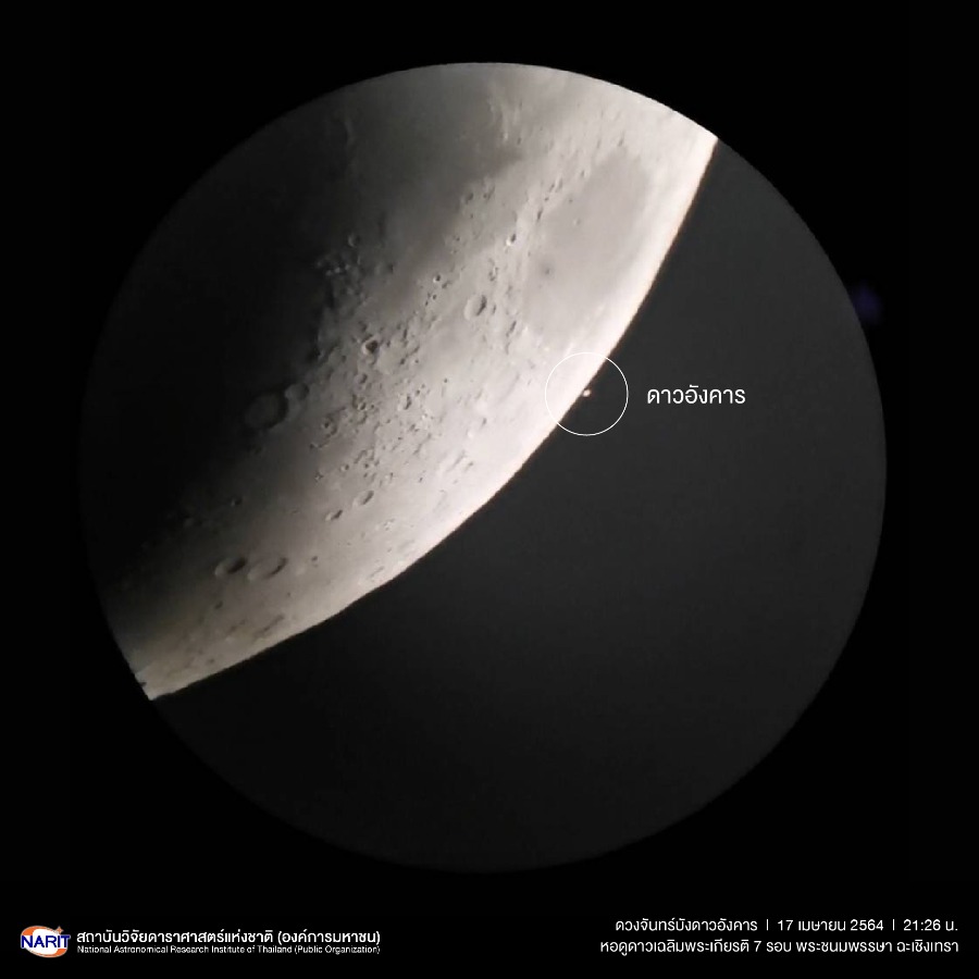 สถาบันวิจัยดาราศาสตร์แห่งชาติ (องค์การมหาชน) (สดร.) เปิดเผยภาพ "ดวงจันทร์บังดาวอังคาร" เมื่อคืนวันที่ 17 เมษายน 2564 ที่ผ่านมา โดยดาวอังคารเริ่มสัมผัสขอบดวงจันทร์ ในเวลาประมาณ 21.28 น. ซึ่งปรากฏการณ์ดังกล่าวหาชมได้ยากในไทย และเกิดขึ้นไม่บ่อยนัก ครั้งต่อไปที่สามารถสังเกตในไทย อีก 19 ปีข้างหน้า วันที่ 22 มีนาคม 2583