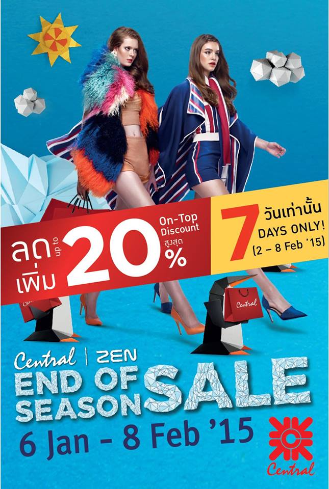 ห้างเซ็นทรัลเฟสติวัล เชียงใหม่ และเซ็นทรัลกาดสวนแก้ว ชวนช้อปเทศกาลลดราคา จัดรายการ“Central / ZEN End Of Season Sale” สินค้าคุณภาพ ลด 30-50% , บิวตี้ แกลอรี ลด 10-15 %, เครื่องครัว ลด 10-30% พิเศษสุด ! 7 วันสุดท้าย ตั้งแต่วันที่ 2-8 ก.พ.58 ลดเพิ่มสูงสุดอีก 20% พร้อมรับฟรีบัตรกำนัลจาก True Fitness มูลค่า 6,000 บาท เมื่อช้อปครบ 3,000 บาทขึ้นไป ที่ห้างเซ็นทรัลทุกสาขา