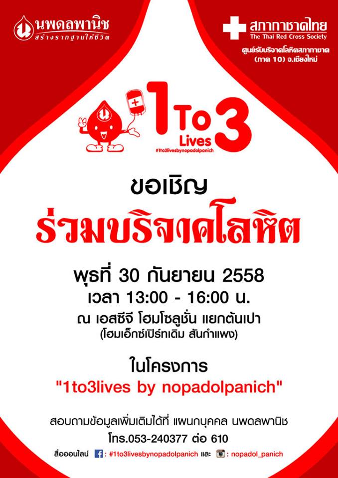 นพดลพานิช ขอเชิญร่วมบริจาคโลหิต ในโครงการ "1 To 3 lives by Nopadolpanich" วันพุธ ที่ 30 ก.ย.58 เวลา 13.00-16.00 น. ณ เอสซีจีโฮมโซล...