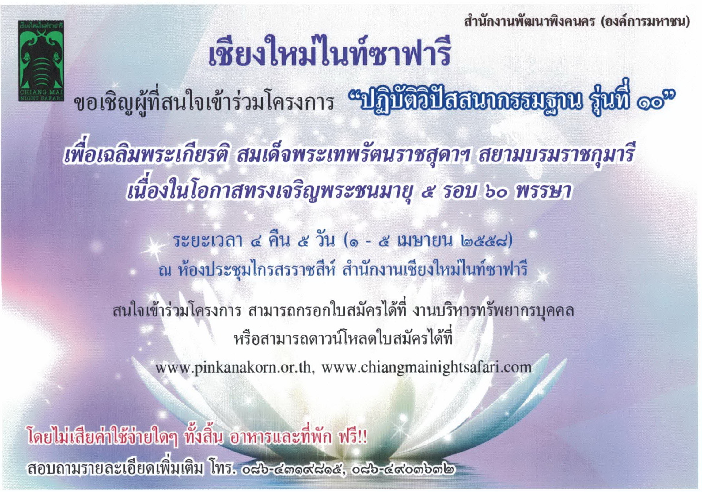 เชียงใหม่ไนท์ซาฟารี สำนักงานพัฒนาพิงคนคร (องค์การมหาชน) จัดปฏิบัติวิปัสสนากรรมฐานรุ่นที่ 10 เฉลิมพระเกียรติ สมเด็จพระเทพรัตนร...