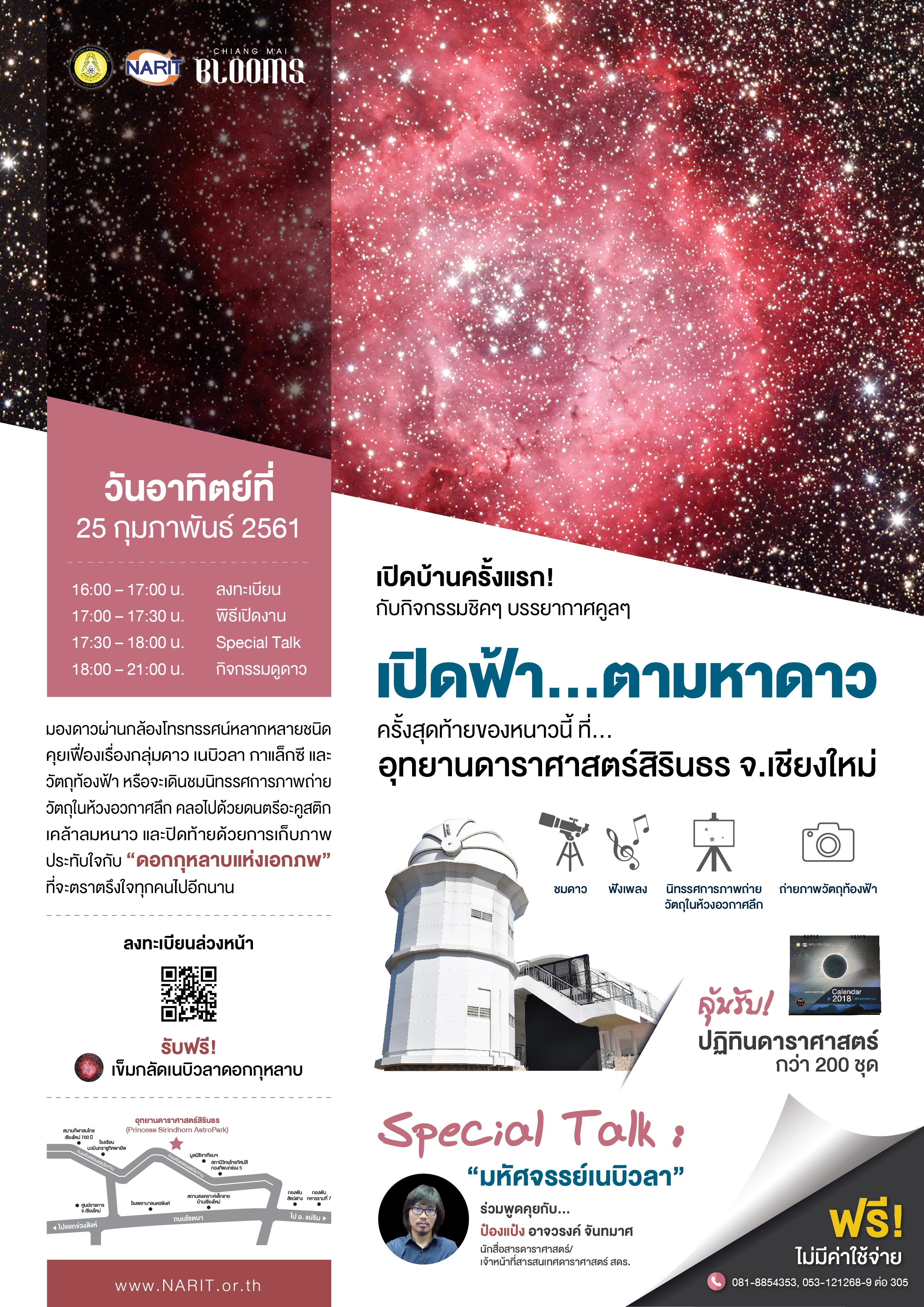 สถาบันวิจัยดาราศาสตร์ (องค์การมหาชน) หรือ สดร. จัดกิจกรรม "เปิดฟ้า...ตามหาดาว" ครั้งที่ 6 ประจำปี 2561 ส่งท้ายหนาวนี้ เปิดบ้านใหม่...